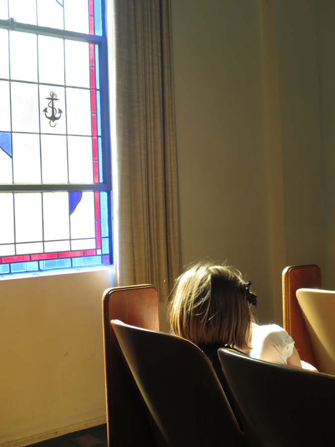 There's a blessing to busyness, and we only had a few minutes to eat and change before heading up to Burbank. The traffic on the way to the Wahler funeral was horrible, so with all the griping and complaining we were able to extract from that we all kept pretty well focused on other things and reasonably composed. It was only L, who internalizes stress in ways I haven't yet come to understand, who, once we got to the church, betrayed that all was not well. She began complaining about her stomach and retreated to the sour and bitter attitude of earlier in the day. Her maladies were forgotten when Aunt Claudia and Grandma arrived or Uncle Kyle showed up, but once she was alone again and thinking, her stomach came to the forefront. "I'm not sad about Grampa Dick or GGPA (Lefty)," she quickly disclaimed through her tears, though no one had suggested she was; "My tummy just hurts a lot." After the funeral Stacy took N downstairs to the reception, and I took L outside for a walk and some fresh air. We ended up just sitting on the church's front steps while she cried in my lap. All because of her tummy, of course.